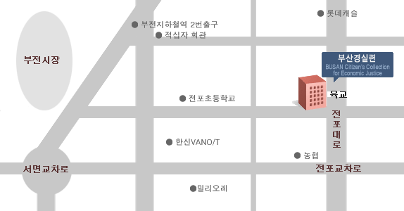 부산경실련 이사했어요~ 작성자 부산경실련쪽지보내기 메일보내기 자기소개 아이디로 검색 전체게시물쪽지보내기 메일보내기 자기소개 아이디로 검색 전체게시물 작성일11-03-04 17:04 조회8,941회 댓글0건 목록 부산 진구 전포2동 642-6번지 2층 [전화번호는 변경없습니다.]버스는 전포초등학교 혹은 밀리오레에서 내리셔서 5분 정도 걸어오시면 되구요지하철은 부전역에서 내리셔서 걸어오시면 됩니다.~이렇게 생긴 건물을 찾아오세요~^^ 페이스북 공유 트위터 공유 댓글목록 등록된 댓글이 없습니다. 목록
