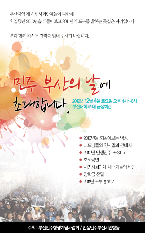 부산지역 시민사회 송년회 <민주부산의 날>에 초대합니다. 작성자 민생민주부산시민행동이름으로 검색이름으로 검색 작성일10-11-16 13:12 조회9,977회 댓글0건 수정 삭제 목록 식사도 제공합니다. 많은 참석 바랍니다. 페이스북 공유 트위터 공유 댓글목록 등록된 댓글이 없습니다. 수정 삭제 목록