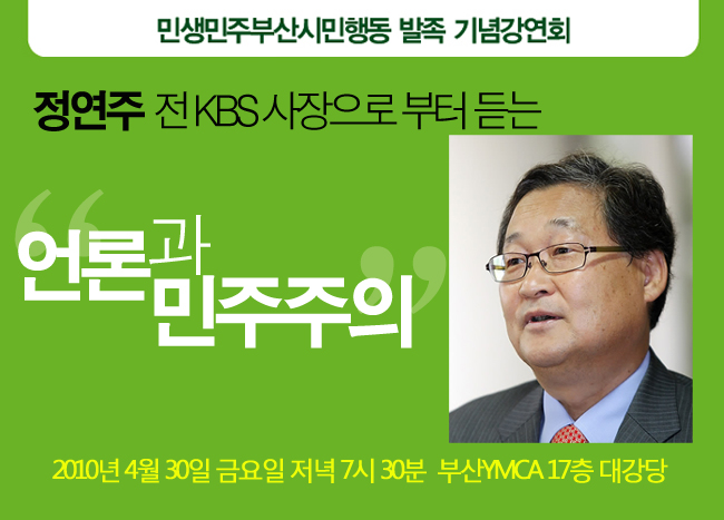 [민생민주부산시민행동 발족 기념강연회]정연주 전KBS 사장으로부터 듣는 "언론과 민주주의" 작성자 민생민주부산시민행동이름으로 검색이름으로 검색 작성일10-04-09 15:21 조회9,342회 댓글0건 수정 삭제 목록 ^^ 페이스북 공유 트위터 공유 댓글목록 등록된 댓글이 없습니다. 수정 삭제 목록