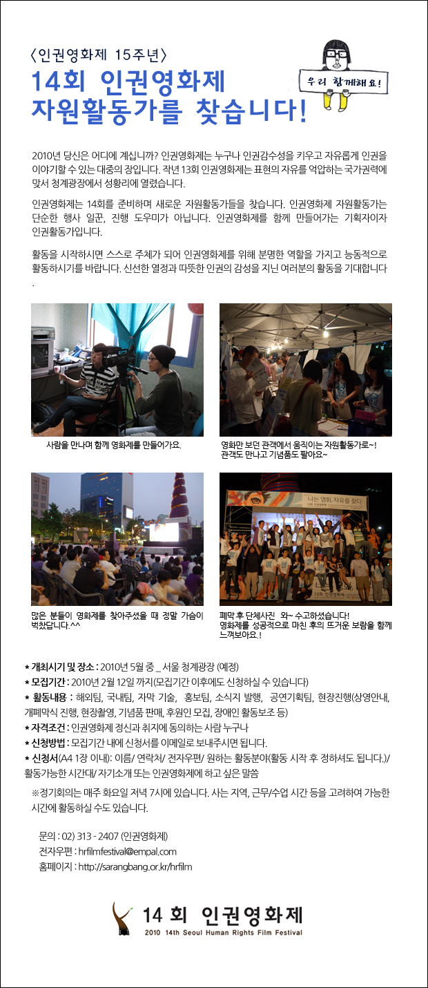 인권영화제는 14회를 준비하며 새로운 자원활동가들을 찾습니다. 인권영화제 자원활동가는 단순한 행사 일꾼, 진행 도우미가 아닙니다. 인권영화제를 함께 만들어가는 기획자이자 인권활동가입니다.