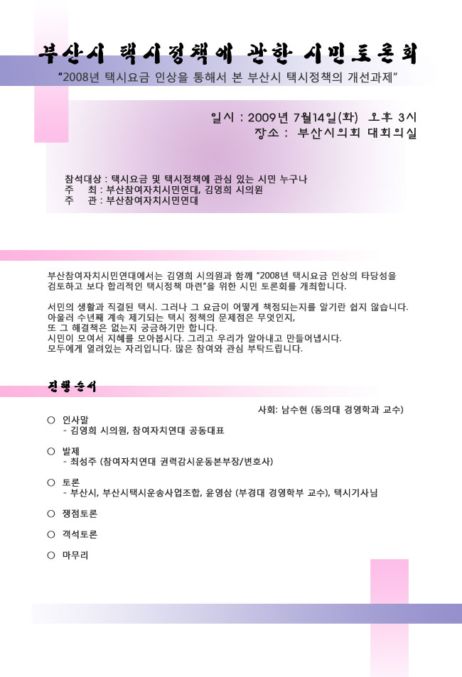 부산시 택시정책에 관한 시민토론회 안내 작성자 참여자치시민연대홈페이지 이름으로 검색홈페이지 이름으로 검색 작성일09-07-08 13:17 조회10,589회 댓글0건 수정 삭제 목록 부산시 택시정책에 관한 시민토론회 안내■ 일시 : 2009년 7월14일(화) 오후 3시■ 장소 : 부산시의회 대회의실많은 참여바랍니다. 페이스북 공유 트위터 공유 댓글목록 등록된 댓글이 없습니다. 수정 삭제 목록